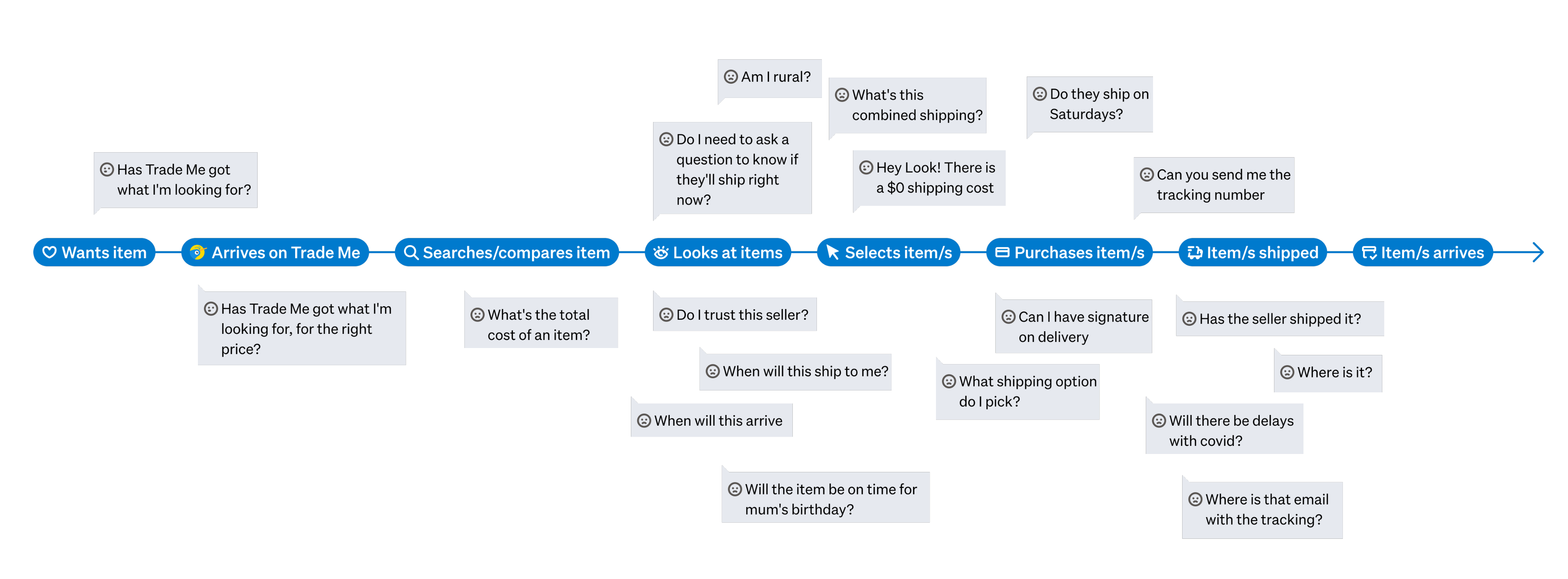 At the beginning of the project, we conducted user interviews and surveys to understand buyer pain points around shipping. I facilitated the user research testing concepts through 1 hour long user interviews. From this research we could conclude that our hypothesis “We can improve Trade Me for buyers and increase conversion by providing upfront/transparent shipping information (speed, price, availability)” was worth pursuing and we were solving a real user problem.